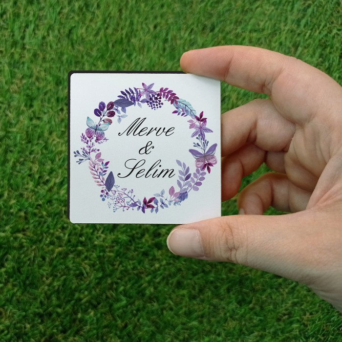 Mor Çiçekli Kare Ahşap Magnet